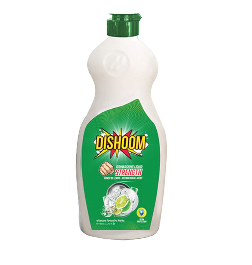 Dishoom Dishwashing liquid removes all kinds of hard stains effortlessly and makes the dishes shiny, clean and fragrant. Its antimicrobial agent easily removes hard stains and protects from germs, ensuring the scent of lemon in it. Dishoom Dishwashing liquid, have the power of lemon which makes the dishes clean as well as make good fragrance after washes dishes. Also have antimicrobial agent which makes the dishes germ free and protect to come germ again on plate after cleaning. This dishwashing liquid made with the strengthen power of lemon and antimicrobial agent ensures the highest guaranteed of cleaning and germ-killing form dishes.